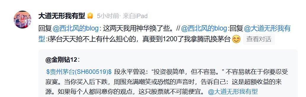 虽然表示“今天真没买”,不过段永平更早些时候透露,这两天用中国神华换了些贵州茅台。