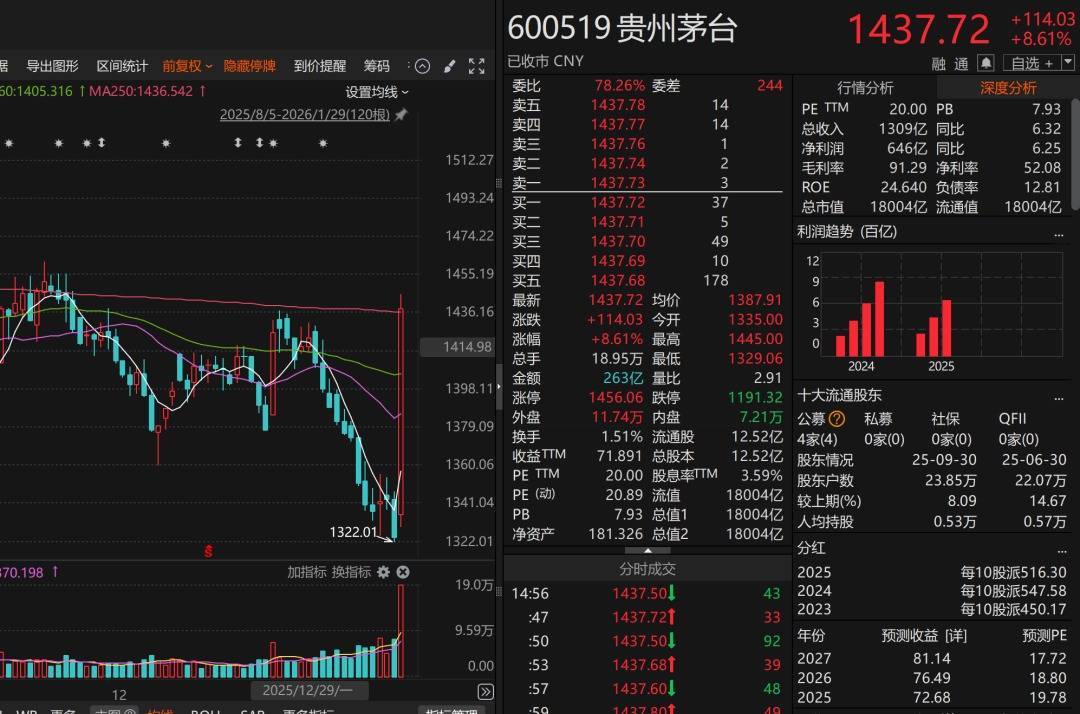 在长时间股价低迷后,1月29日,贵州茅台股价罕见大涨8.61%。