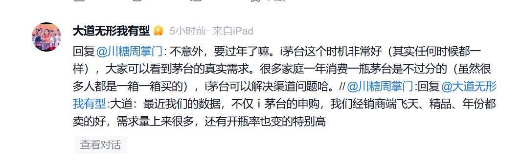近期,段永平频频谈及贵州茅台。今天他再次表示,i茅台可以解决渠道问题。他此前曾强调,i茅台至少基本解决了两个问题:一是解决了假酒问题,这个释放的购买力是难以想象的;二是价格高企问题,这个释放的购买力也是巨大的。