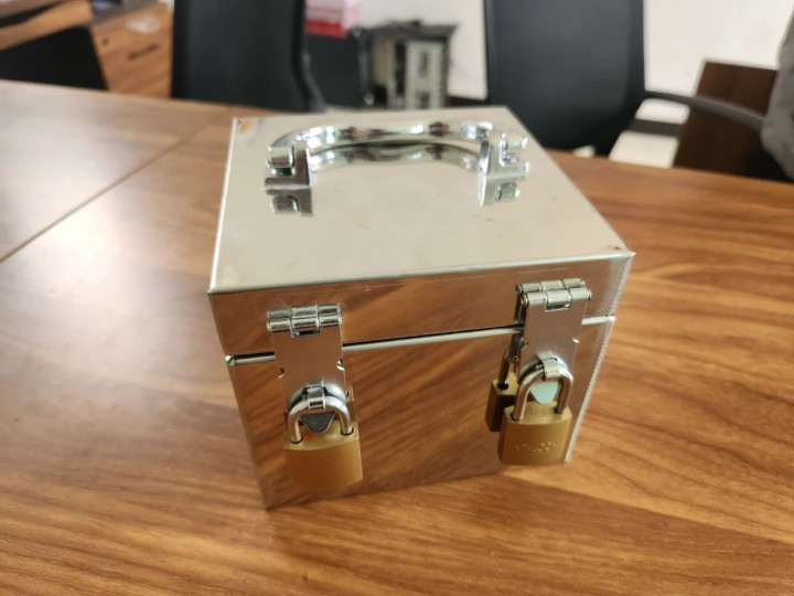 一问才知,村委会公章被镇政府锁进了铁箱,上了两把锁,一把钥匙在村里,另一把钥匙由乡镇干部保管。记者看到,所谓的铁箱就在便民服务中心的柜子上放着,想打开,并不容易,需找乡镇包村干部拿钥匙,而此时乡镇包村干部已下班。