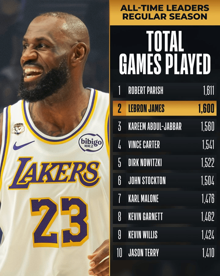 湖人球员勒布朗-詹姆斯生涯第1600场比赛,距离历史第一罗伯特-帕里什(1611场)还差12场。