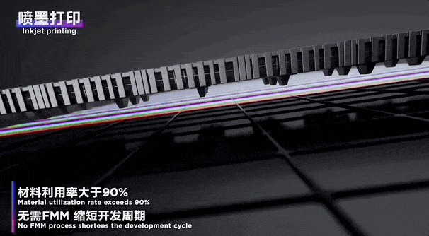 印刷OLED则是完全独立于蒸镀的路线。它类似于喷墨打印机一样把发光材料滴到基板上,不需要掩膜版,而且定位精度可以控制在微米级别。相比于蒸镀工艺,喷墨印刷最大的优势是材料利用率高,蒸镀工艺只有30%的利用率,而印刷OLED工艺可以实现90%以上的利用率。