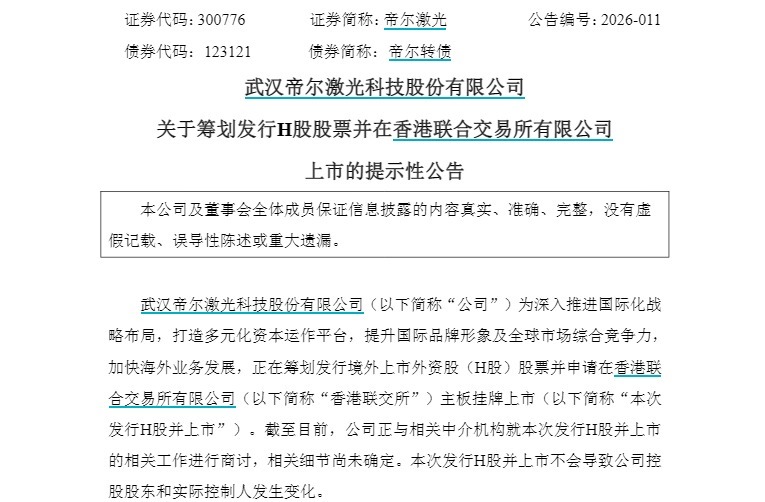 1月27日晚,帝尔激光发布公告称,为深入推进国际化战略布局,打造多元化资本运作平台,提升国际品牌形象及全球市场综合竞争力,加快海外业务发展,公司正筹划在港交所主板挂牌上市事宜。