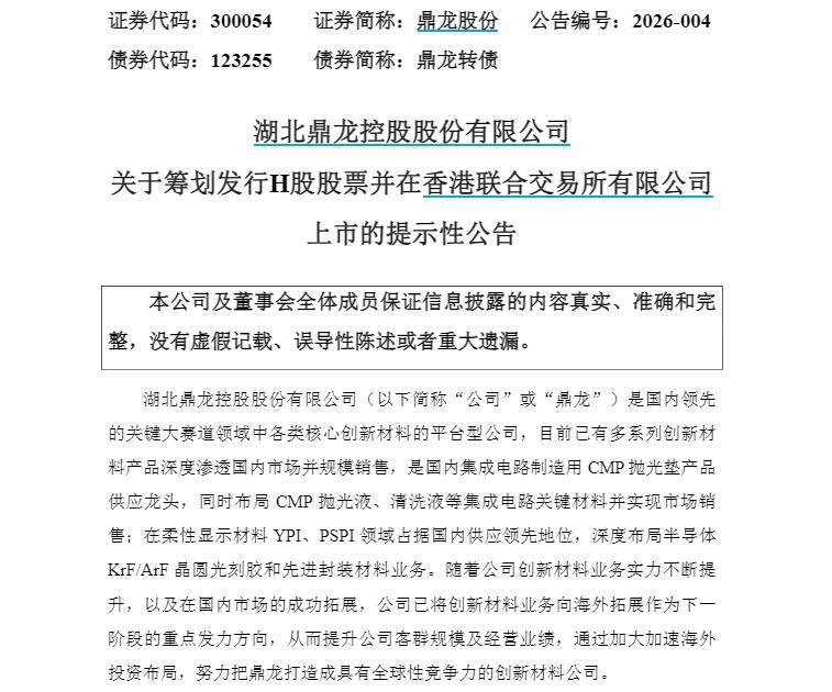 1月14日,鼎龙股份发布公告,为深化公司在创新材料领域的全球化战略布局,提升公司品牌国际影响力和综合竞争力,同时搭建国际化资本运作平台,增强境外融资能力,助力公司高质量可持续发展,公司目前正在筹划境外发行股份(H股)并在香港联交所上市事项。