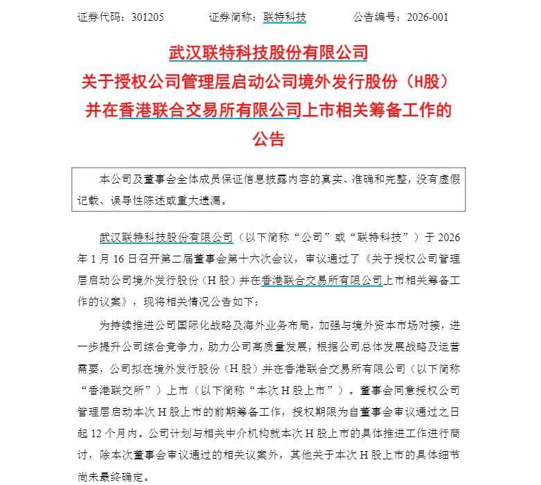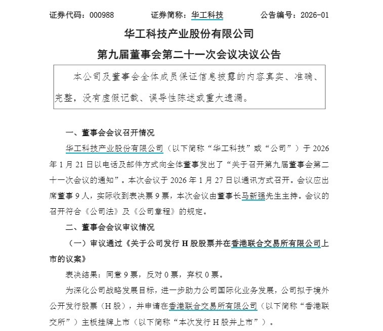 1月28日,华工科技审议通过《关于公司发行H股股票并在香港联合交易所有限公司上市的议案》。去年10月,华工科技发布公告称,为深化公司全球化战略布局,公司拟筹划发行境外上市外资股(H股)股票并申请在香港联交所主板挂牌上市。