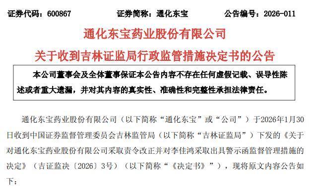 1月30日晚间,通化东宝(600867)公告称,公司于2026年1月30日收到吉林证监局下发的《关于对通化东宝药业股份有限公司采取责令改正并对李佳鸿采取出具警示函监督管理措施的决定》。
