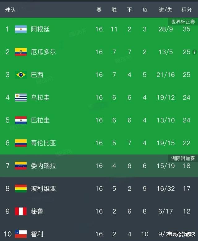 南美区世预赛16轮过后,阿根廷以35分排名第一,厄瓜多尔25分排名第二,巴西25分排名第三,这3队领先第7名委内瑞拉至少7分以上,在预选赛还剩两轮的情况下,这3队都已经提前晋级2026年世界杯正赛,其中阿根廷更是提前好几轮就出线了。