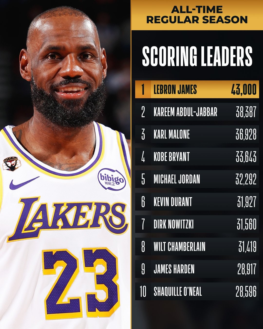 北京时间2月23日,NBA常规赛,在湖人主场对阵凯尔特人的比赛中,勒布朗-詹姆斯正式突破了43000分大关。