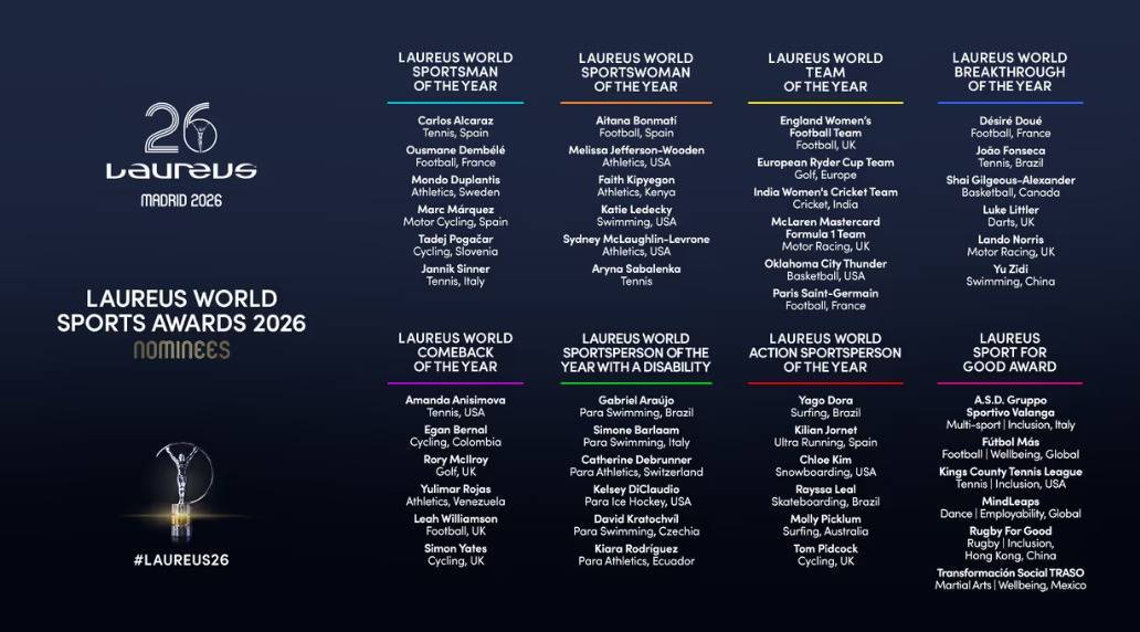 此外,在今年的劳伦斯世界体育奖其他奖项评选中,网坛“双雄”阿尔卡拉斯、辛纳和金球奖得主登贝莱领衔男子年度最佳运动员提名,西班牙女足运动员邦马蒂、网球运动员萨巴伦卡则领衔女子年度最佳运动员提名,F1(世界一级方程式赛车锦标赛)迈凯伦车队、法国巴黎圣日耳曼足球队以及美职篮俄克拉荷马雷霆队等则获年度最佳团队奖提名。