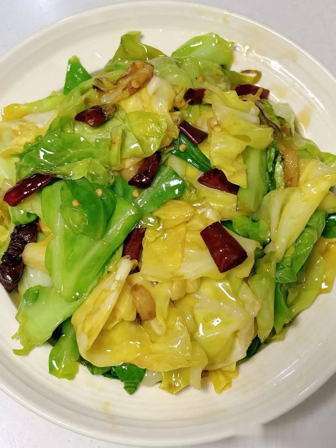 3. 淋酱汁快速炒匀即可(保持包菜脆感)。效果:包菜每100克含钾124毫克,富含维生素U(甲硫氨酸),能修复胃黏膜、辅助肝脏代谢;干辣椒促进血液循环。这道菜酸辣爽口,适合消化不良、胃胀人群。