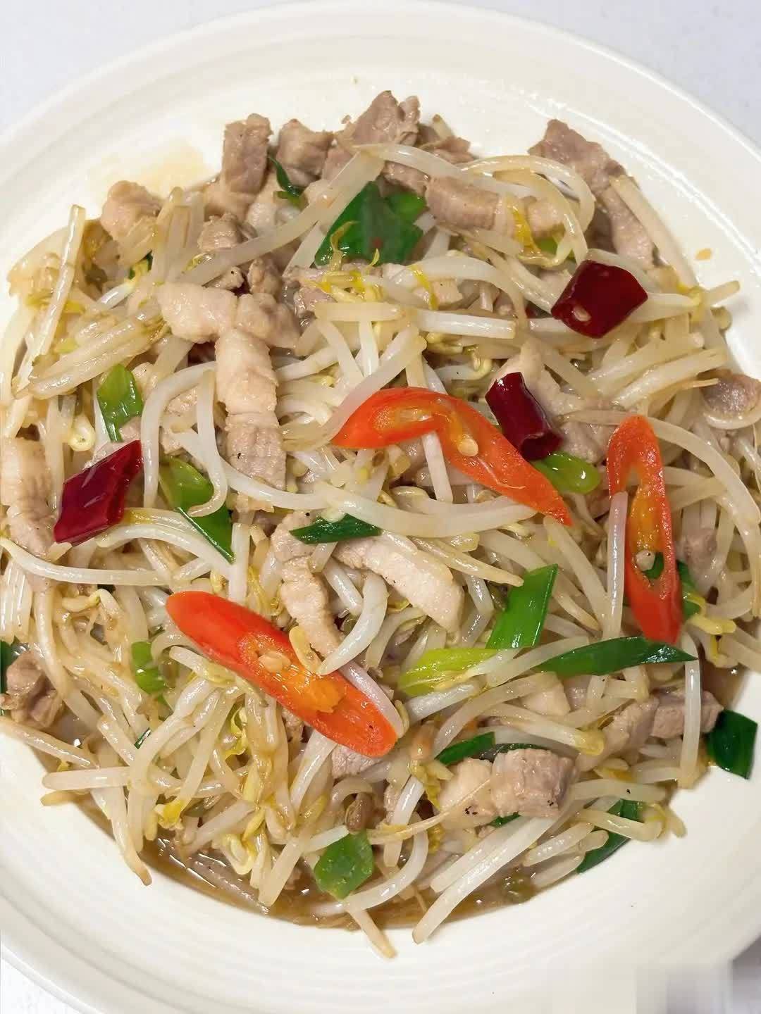 2. 锅中热油,下肉丝翻炒至变色,加豆芽大火翻炒1分钟。