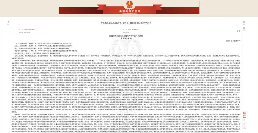 近日,新疆维吾尔自治区乌鲁木齐市中级人民法院发布了该案二审民事判决书。